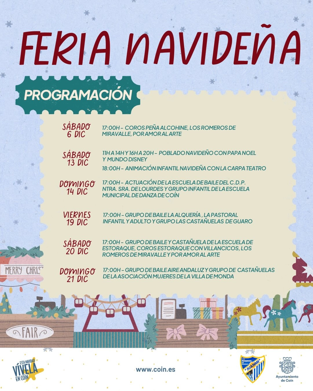 El Ayuntamiento de Coín ha presentado la Feria Navideña, que se celebrará en el recinto ferial durante las próximas semanas con una propuesta pensada para toda la familia, combinando atracciones infantiles y una cuidada programación cultural los fines de semana.