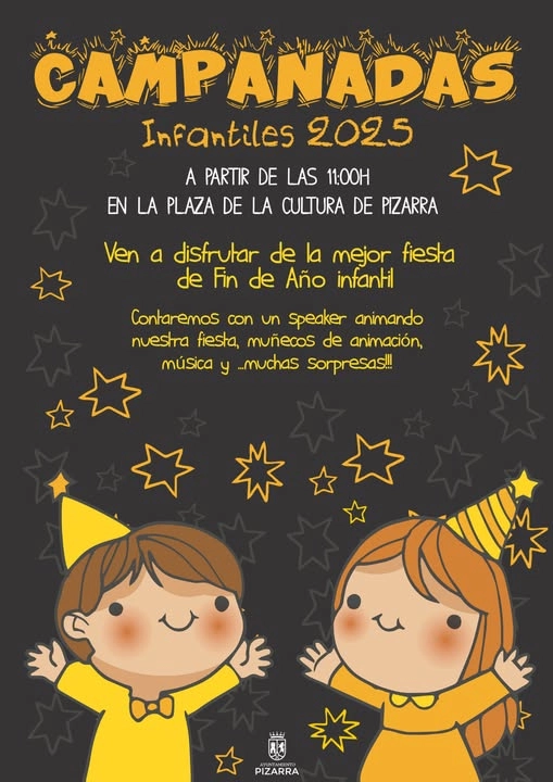 La Plaza de la Cultura acogerá el próximo miércoles 31 de diciembre, a partir de las 11:00, las Campanadas Infantiles 2025, una iniciativa impulsada por el Ayuntamiento de Pizarra con el objetivo de que los más pequeños puedan vivir la despedida del año en un ambiente festivo, seguro y adaptado a su edad.